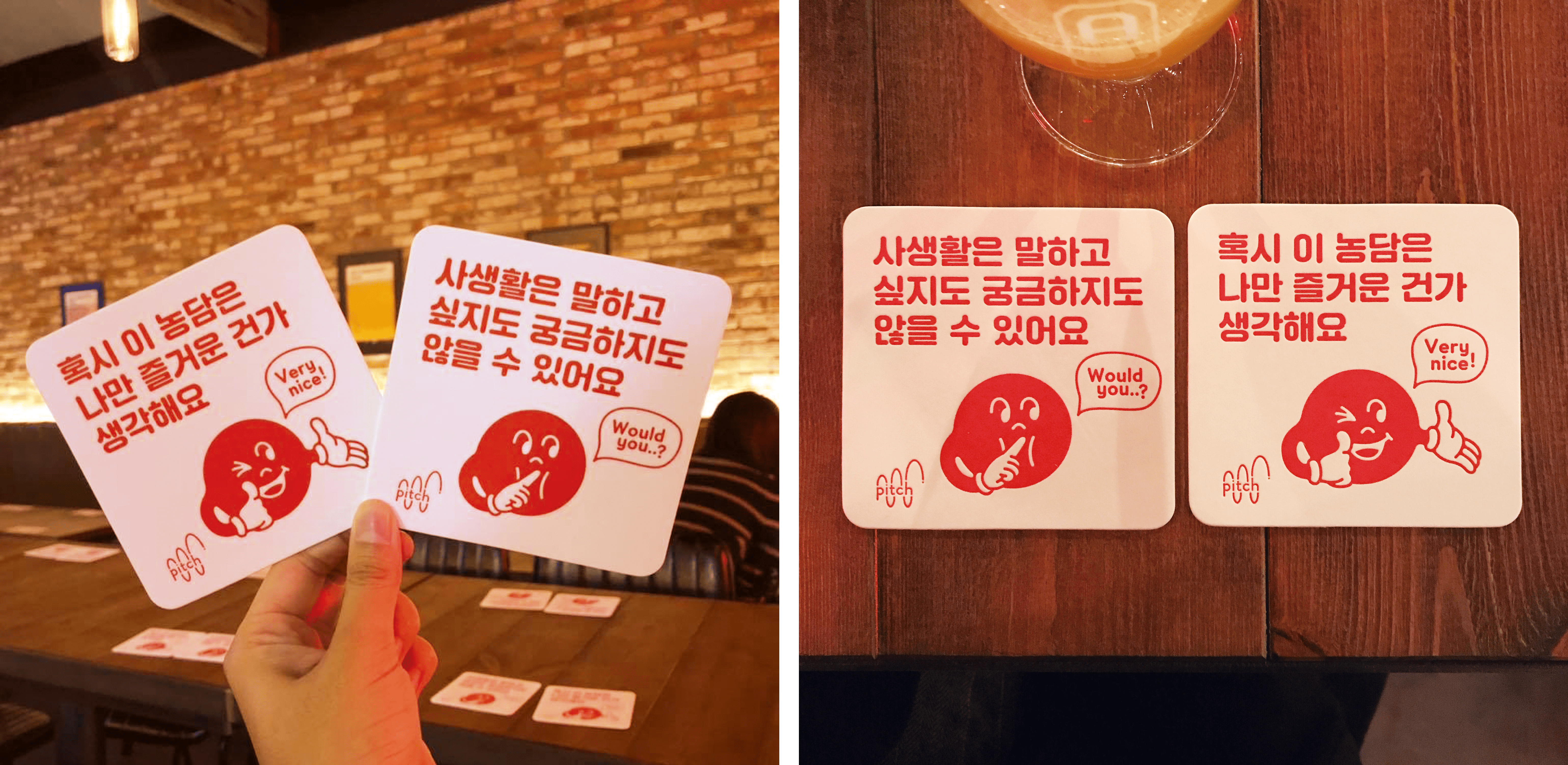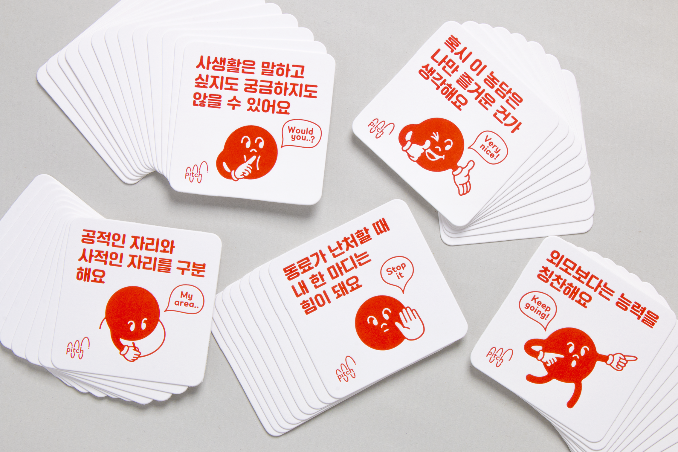 슬로워크에는 여성구성원의 일터에서의 자유를 보장하는 사내 여성자유보장위원회 Pitch가 있습니다. 정기적으로 구성원의 고충을 수집하고, 직장 내에서 불편한 말이나 행동이 발생하는 상황을 자연스럽게 바꿀 수 있는 솔루션을 고민했죠. 권력관계가 존재하는 장소, 긴장이 풀릴 수 있는 시점에 맞는 형태(코스터)와 디자인(캐릭터의 메시지 전달)을 개발해 무겁지 않으면서도 명확하게 메시지를 전달했습니다.