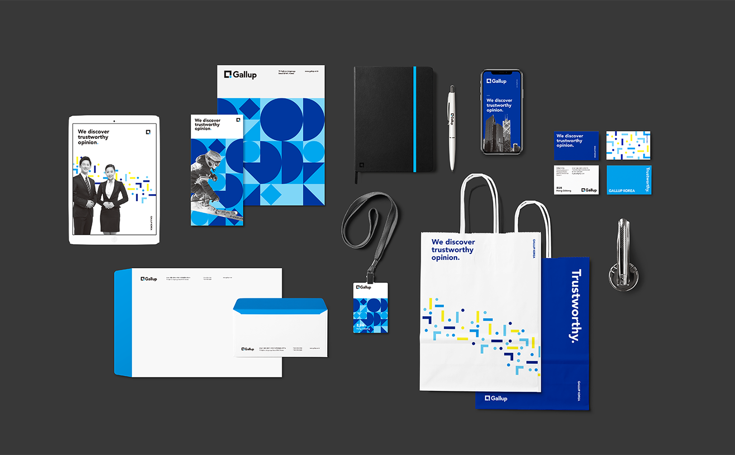 한국갤럽 리브랜딩 프로젝트는 대한민국 대표 조사회사로서의 상징성과 높은 인지도를 유지하고 강화하면서도 오래되어 보이는 비주얼 이미지의 개선을 목적으로 진행되었습니다. 파란 점에서 시작해 파란 점으로 완결되는 정사각형 심볼은 올바른 질문에서 정확한 답을 찾아가는 한국갤럽의 끊임없는 여정을 상징합니다. 브랜드 철학이 조직 안팎에 공유될 수 있도록 다양한 고객경험 접점에 맞는 디자인도 함께 개발했습니다.