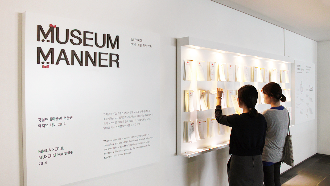 국립현대미술관 서울관이 2014년 관람예절 캠페인을 함께 진행하자고 슬로워크를 찾아왔습니다. 처음에는 미술관 측에서 예절 몇 가지를 제시하고 시민들이 서명하는 방식을 제안했는데요. 슬로워크는 어렵다고 봤어요. 미술관 예절을 정의할 수도 없을 뿐더러 일방적으로 예절을 정해서 이대로 하라고 ‘가르치는’ 방식의 캠페인은 곤란했습니다.