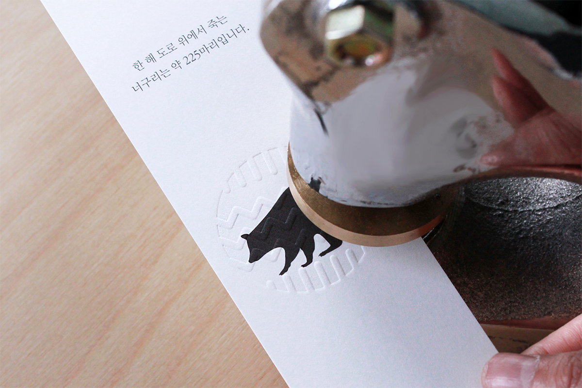 슬로워크는 이 계기를 통해 눈에 보이는 디자인뿐 아니라 눈에 안보이는 관계에 집중을 하게 되었습니다. 로드킬 캠페인은 인간과 생명의 관계를 회복하는 작은 캠페인입니다. 잉크는 인쇄소의 버려지는 잉크를 모아서 인쇄했고 그래서 이렇게 다 까맣게 나왔어요. 이후 블로그를 통해 인쇄 방법과 제작 과정, 그리고 원본 그래픽 파일을 오픈소스로 공개했습니다. 보다 많은 사람들이 슬로워크가 만든 도구를 활용해서 더 가치있는 것들을 만들 수 있도록 말이죠.