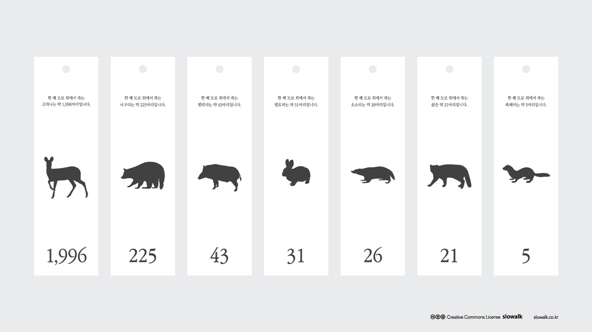이번에는 슬로워크의 로드킬 캠페인이에요. 로드킬은 동물이나 곤충이 도로에 나왔다가 교통수단에 치여 사망하는 것을 의미합니다. 한국도로공사에 따르면 2012년 고속도로에서만 약 2,360건의 로드킬이 발생했대요. 일반도로를 합치면 숫자는 더 커지겠죠. 슬로워크는 여기 문제의식을 가지고 로드킬을 막자는 의미로 책갈피와 포스터를 만들었습니다.