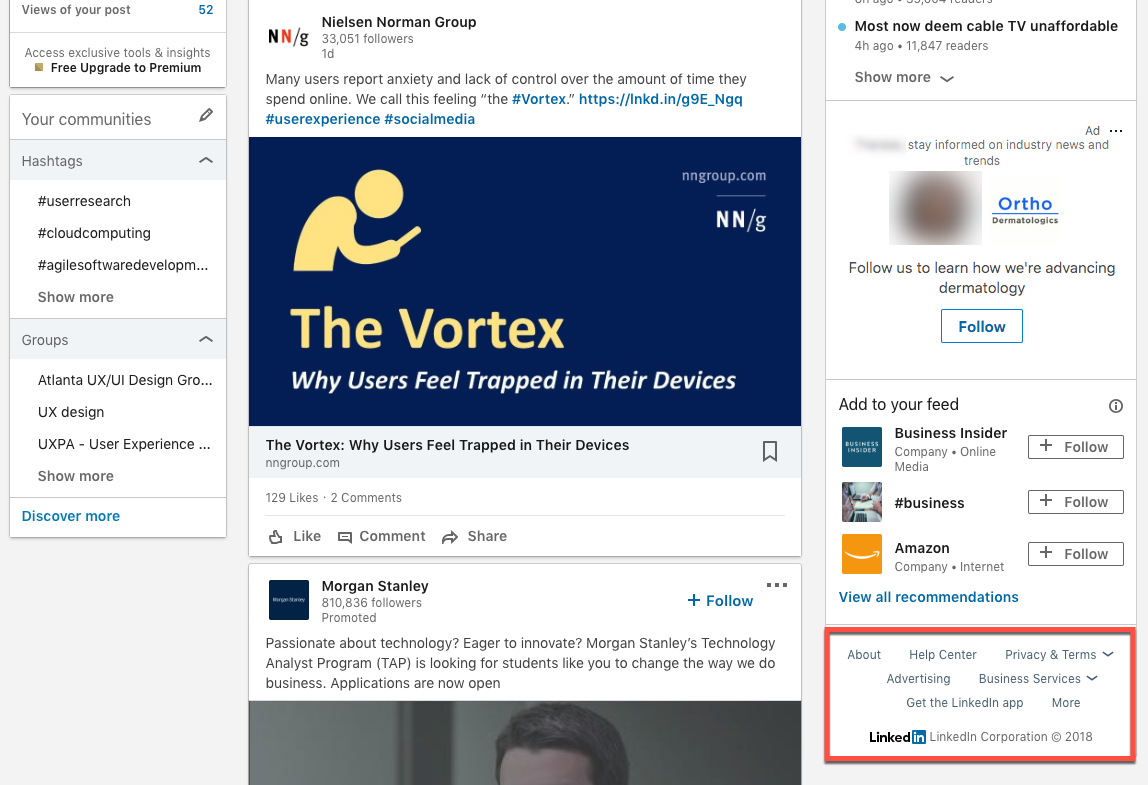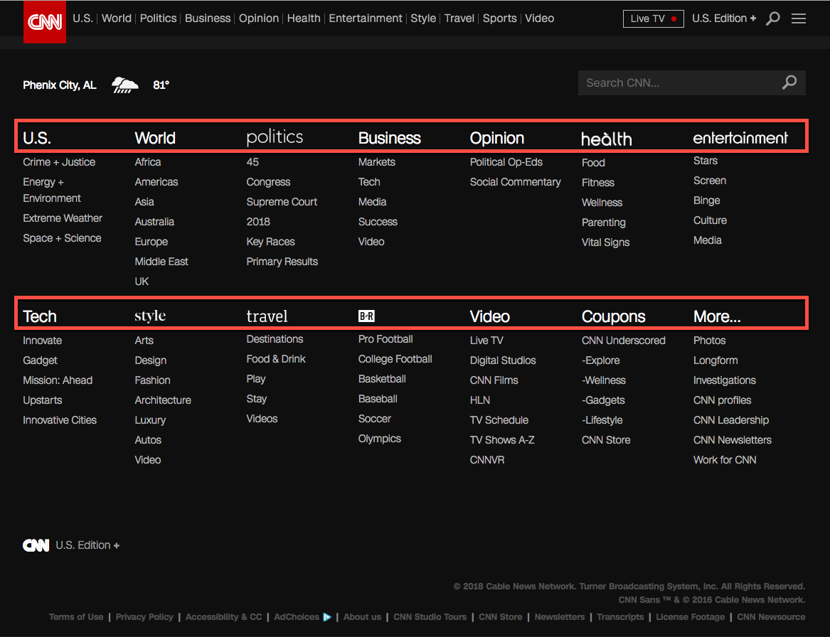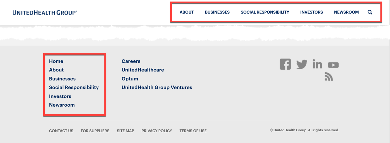 일반적으로 글로벌 내비게이션이나 유틸리티 내비게이션에는 존재하지 않는 작업입니다. 이러한 유형의 푸터 콘텐츠는 여러 사용자 그룹(고객, 지원자 등)이 방문하는 사이트에서 흔히 볼 수 있어요. 사용자 사이트의 주 목적과 관련이 없는 부차적인 콘텐츠를 효과적으로 찾을 수 있도록 지원해줄 때 많이 씁니다.
