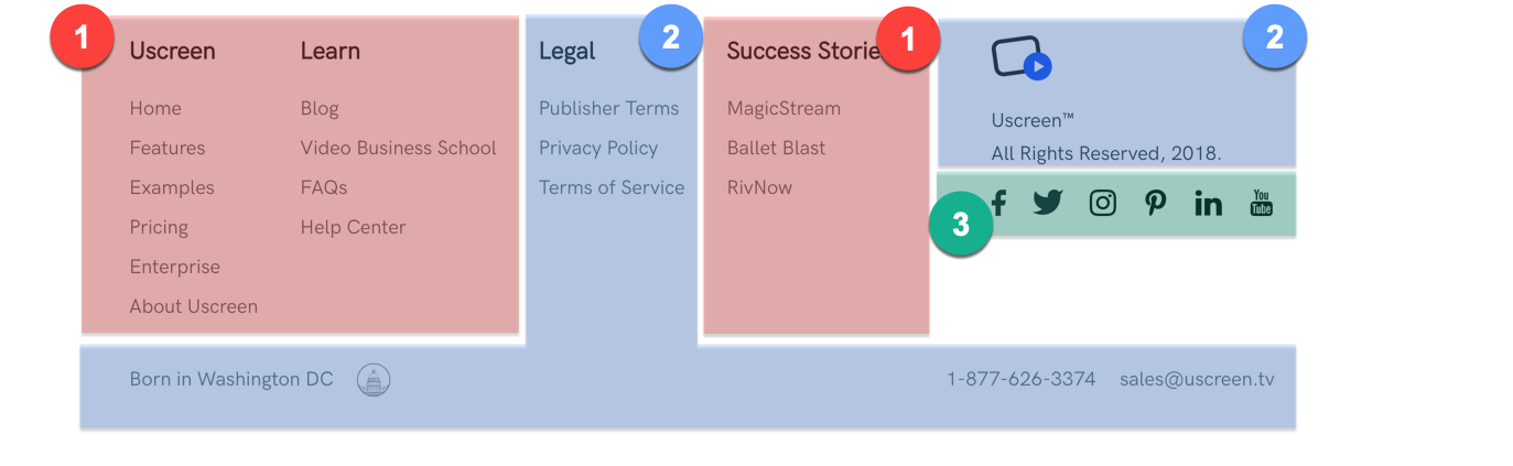 이제 웹사이트 설계자는 푸터에 들어갈 콘텐츠를 선택해야 해요. 일반적으로 웹사이트의 목표와 사용자의 목표에 따라 푸터의 구성요소를 정합니다. 다음은 가장 일반적인 요소 목록입니다.