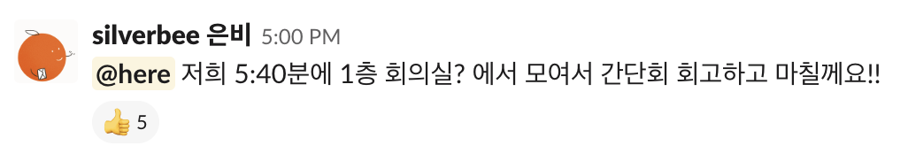 모두가 한창 휴식을 즐기고 있는 와중에 은비가 슬랙 메시지를 보냈어요. 오늘 함께 보냈던 오문산의 소감을 공유하고 하루를 돌아보며 마무리하기 위해서죠. 리모트 근무가 활발한 슬로워크는 구성원의 효율적이고 원활한 의사소통을 위해 다양한 제도와 문화를 갖추고 있는데요. 그중 하나가 바로 ‘회고 문화'예요. 프로젝트를 시작하거나 마칠 때, 한 주의 업무를 시작하거나 마칠 때 등 서로의 소감과 관점, 개선점 등을 공유하는 회고를 진행하죠. 오렌지랩은 매주 진행하는 정기 주간 회고가 있고, 그 외에는 자유롭게 운영하고 있어요. 활발한 의사소통을 통해 구성원끼리 솔직한 이야기를 나눌 수 있고 이를 통해 발전의 기회를 마련해요.