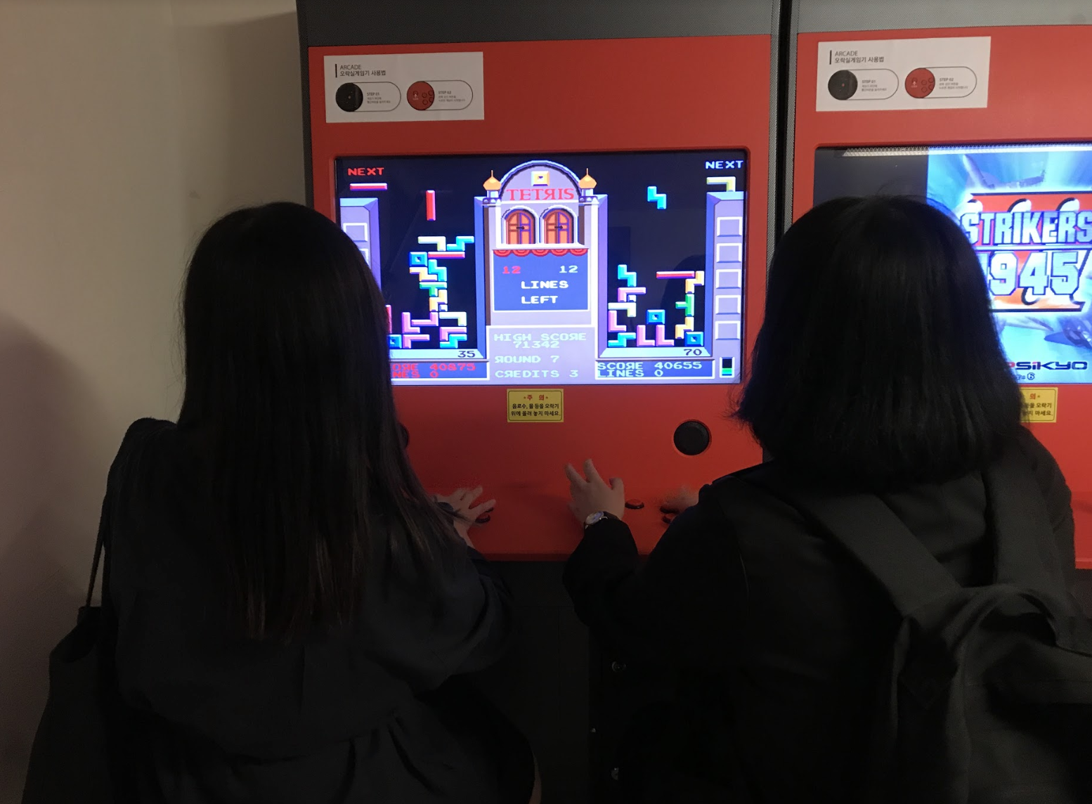 옛날 오락실 게임도 있었어요. 사이 좋게 나란히 앉아 테트리스를 즐기는 좌 은비, 우 누니입니다. 너무 오랜만에 해서 그런지 머릿속으론 어떻게 블록을 차곡차곡 쌓을지 그려지는데, 실전 게임은 시작한 지 채 5분도 지나지 않아 끝이 났네요. 아쉬움을 뒤로한 채! 쿨하게 다른 게임기로 이동했어요.
