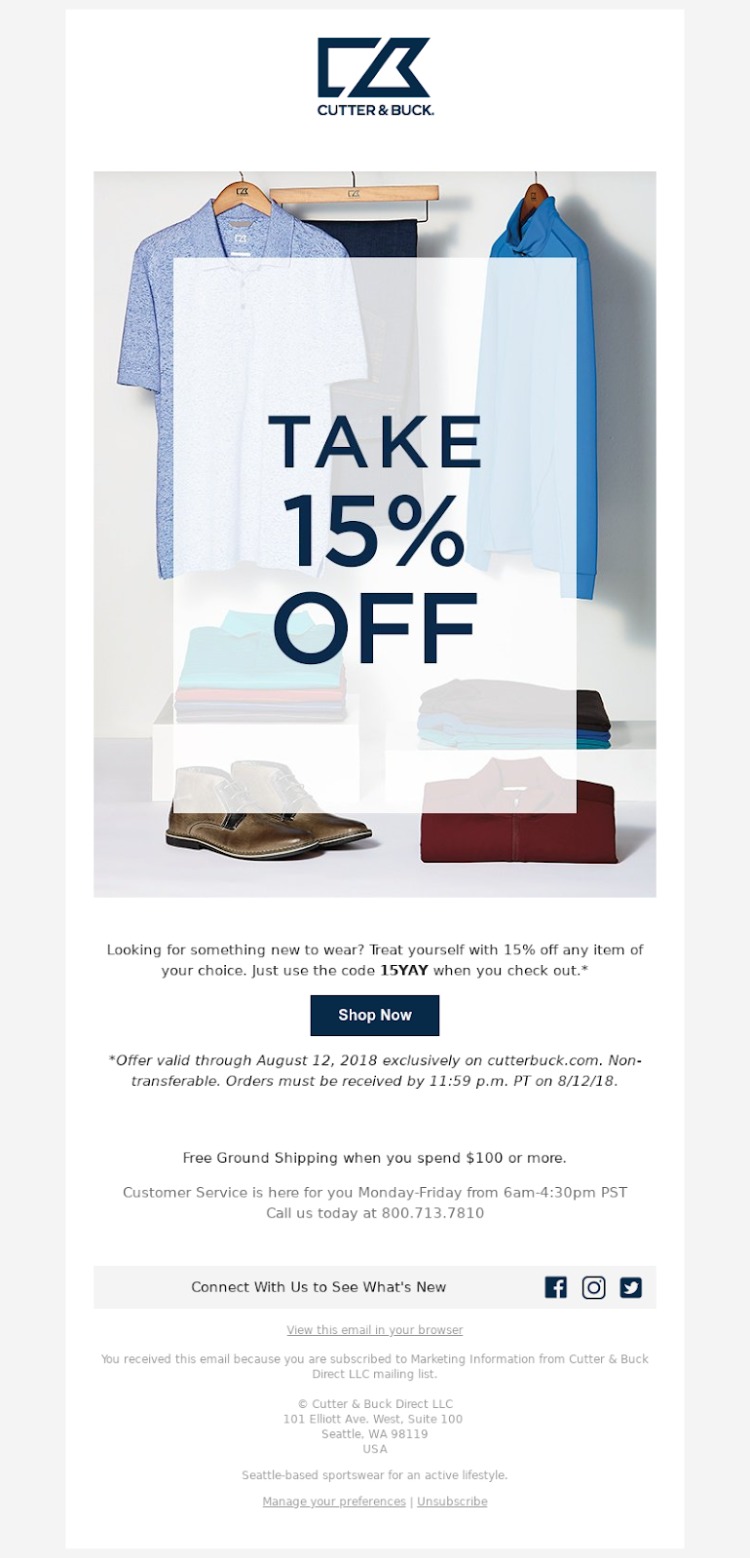 할인 이메일은 효과가 크기 때문에 흔하게 사용됩니다. 이미 회사의 마케팅 캠페인에 참여하고 있는 고객에게 보낼 때, 상품 주문을 망설이는 고객에게 보낼 때 특히 큰 효과를 기대할 수 있어요. 하지만 너무 자주 보내면 오히려 수익성을 떨어뜨릴 수 있으니 주의하세요.