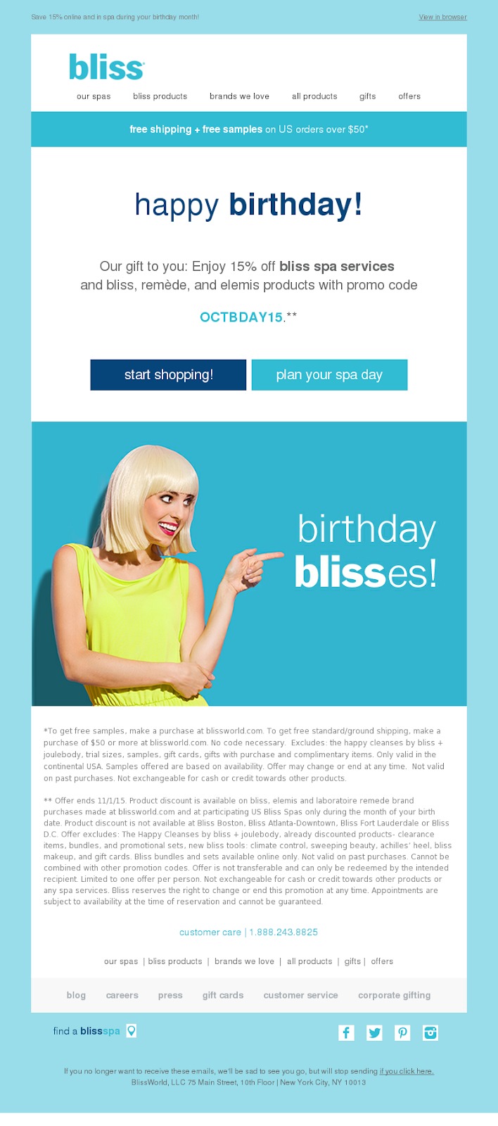 가입자의 기념일에 자동화된 이메일을 사용해 프로모션 코드를 보낼 수 있어요. 생일 이메일은 다른 홍보 이메일보다 최대 342% 더 높은 수익률을 보여주기 때문에 효과적으로 사용할 수 있습니다.