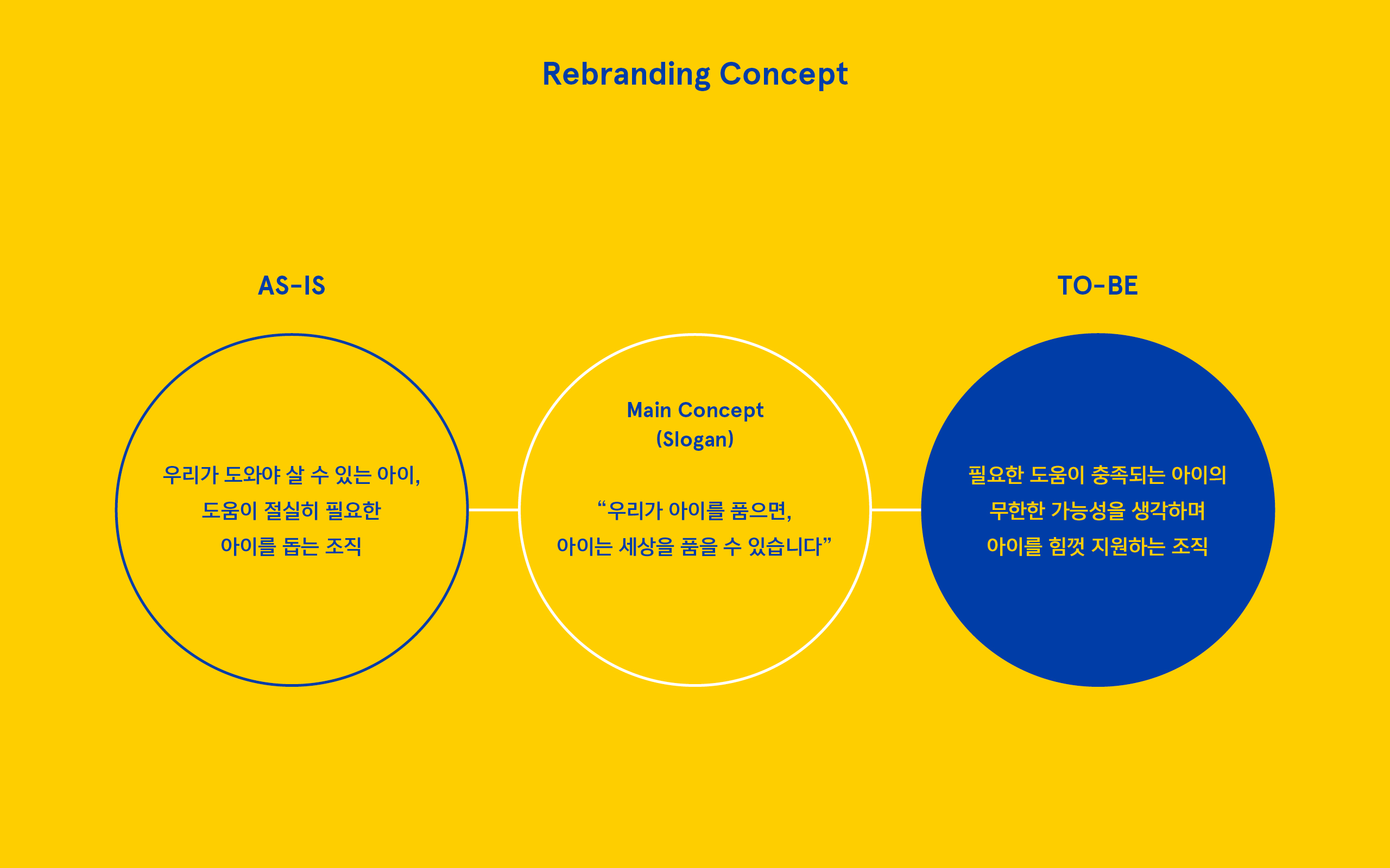 기관 내부의 핵심 이해관계자와 후원자 조사, 그리고 변화한 모금 환경을 바탕으로 분석한 결과를 토대로 메인 콘셉트를 담은 슬로건을 도출했어요. "우리가 아이를 품으면, 아이는 세상을 품을 수 있습니다." 여기서 우리는 라이프오브더칠드런과 후원자, 잠재 후원자 모두를 의미해요. '품다'라는 주요 콘셉트 및 키워드로 브랜드 디자인을 확장했어요.