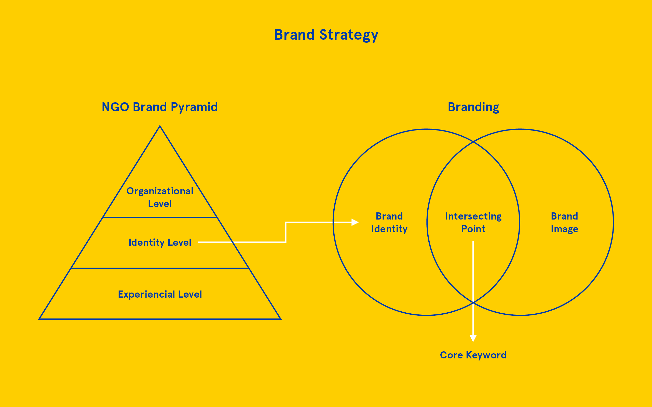 우리는 조직 수준 → 정체성 수준 → 경험적 수준으로 이어지는 비영리조직에서의 브랜드 피라미드에 기반하여 미션문 등 조직의 정체성을 새롭게 정리했어요. 이러한 조직의 아이덴티티와 후원자 니즈에 기반한 브랜드 이미지의 교차점을 확인하여 리브랜딩에서 고려할 주요 키워드를 도출했고요.