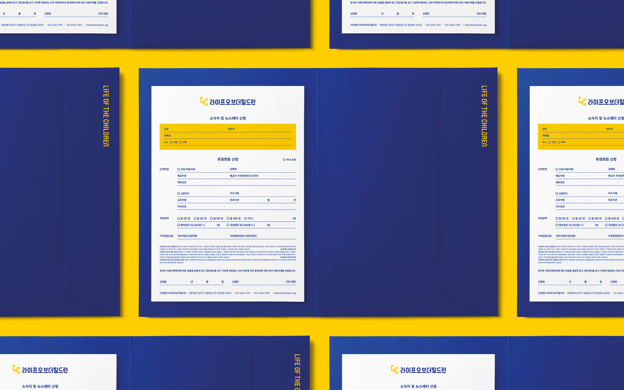 아이들을 주체적인 존재로 강조하면서 눈에 잘 띠고 밝고 긍정적인 느낌을 주는 노란색을 메인 색상으로 설정했어요. 해외 현장이 주요 활동지인 라이프오브더칠드런이 어플리케이션을 쉽고 효과적으로 개발할 수 있도록 보색 대비가 강한 진한 파란색을 서브 색상으로 설정했고요.