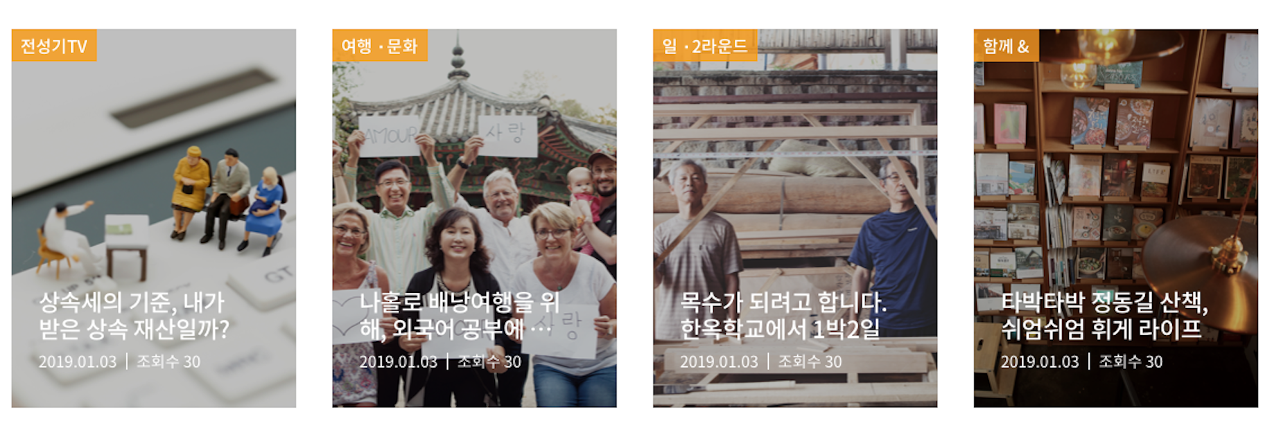 카테고리의 구성만 보아도 전성기닷컴에 50+세대를 위한 디지털 콘텐츠, 사회 활동, 교육, 정보 교류 콘텐츠가 알차게 들어차 있음을 알 수 있겠지요?