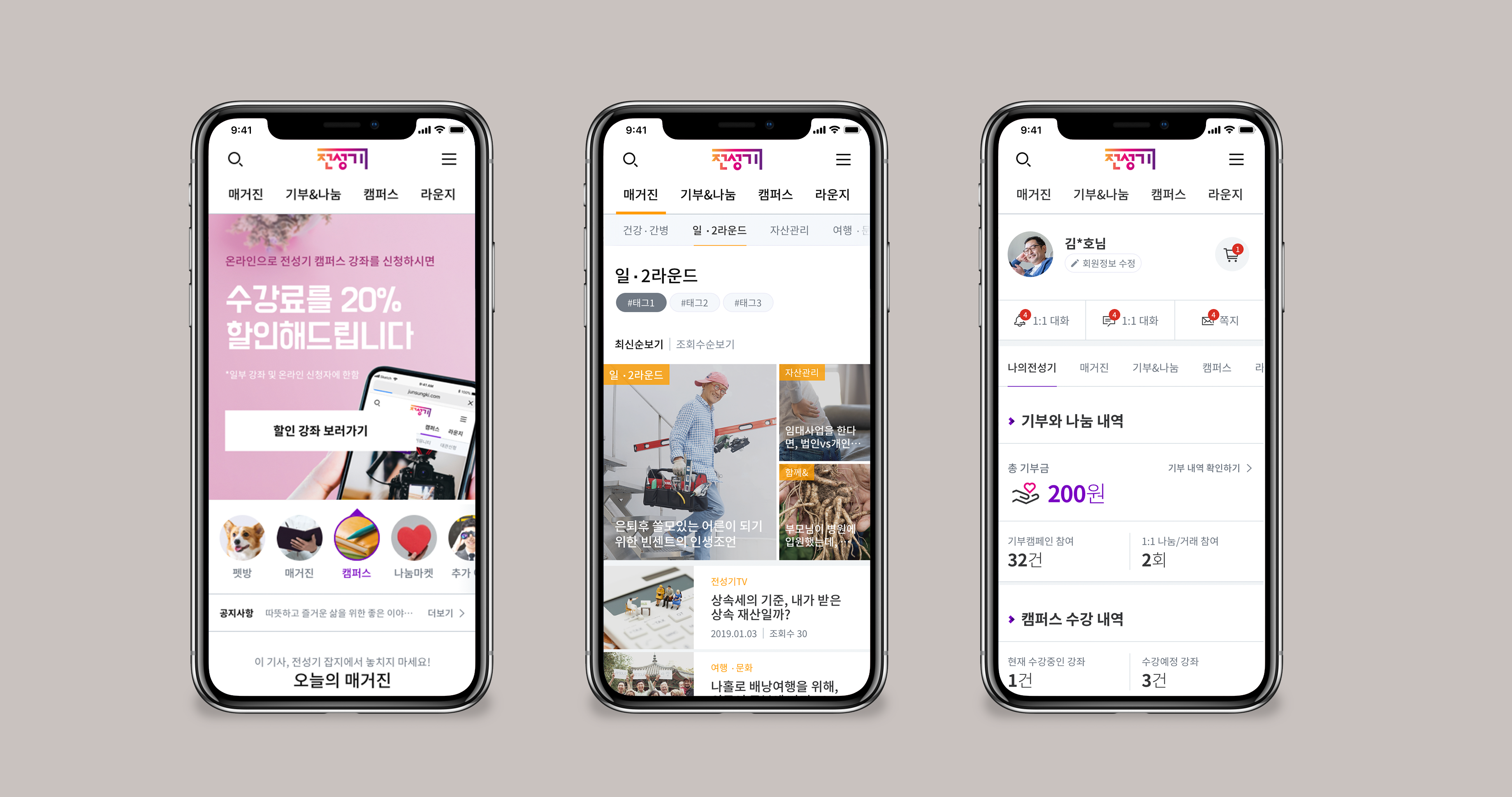 ‘기부&나눔’ 카테고리는 50+세대의 사회 활동을 보여줍니다. 일상에서 실천할 수 있는 기부 캠페인을 페이지 맨 위쪽 전면에 배치해 보기 쉽게 만들었습니다. 이 외에 벼룩시장, 1:1 나눔/거래 플랫폼도 제공합니다. ‘캠퍼스’에서는 교육 강좌와 온라인 커뮤니티를 제공합니다. 전성기 캠퍼스의 기능을 새로운 사이트에도 담은 것이지요. 마지막으로 ‘라운지’는 전성기 회원들이 서로 정보를 주고받는 공간입니다. 반려동물 관련 정보를 나눌 수 있는 게시판인 펫방, 건강 지수 확인 페이지, 이벤트, 공지사항으로 구성됐습니다.