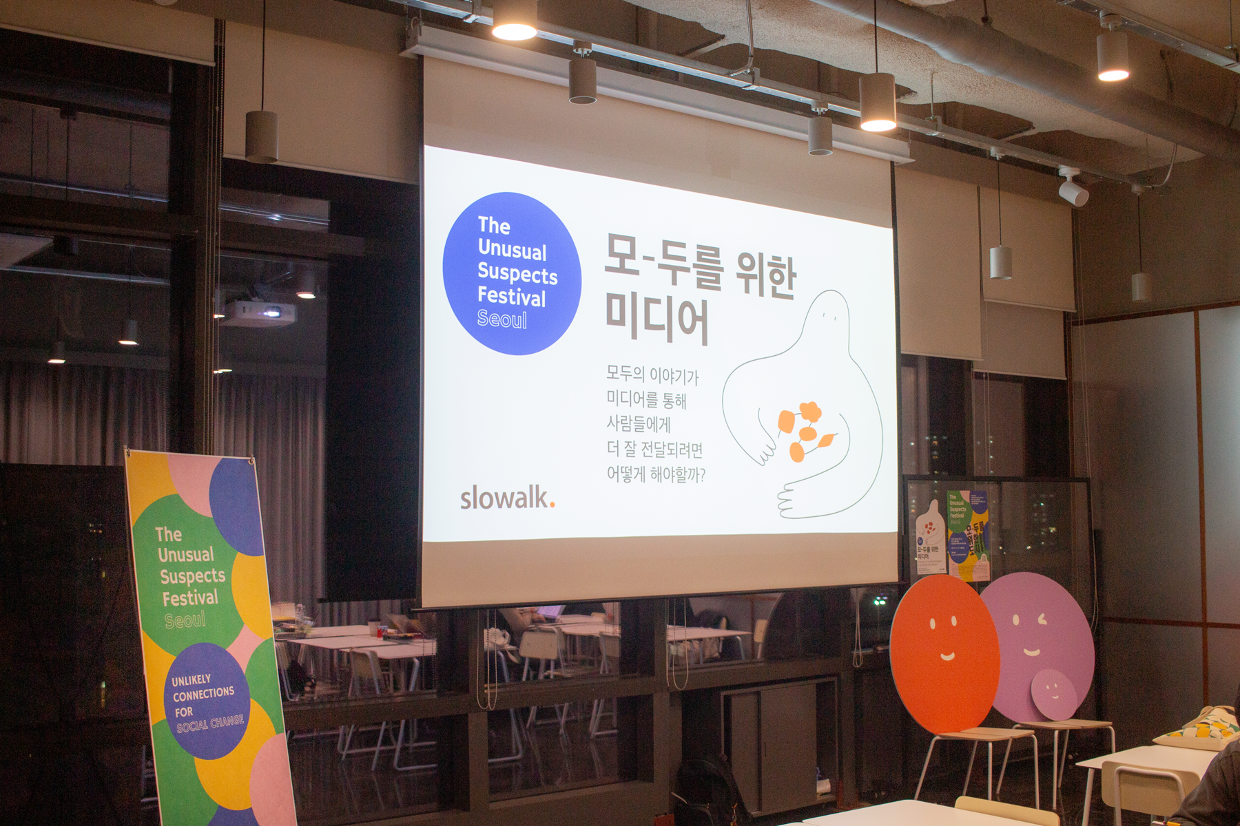 지난해 언서페의 주제는 '모-두를 위한 도시(포용도시)'였어요. 슬로워크가 포용도시에 대해 무엇을 이야기할 수 있을지 감이 잡히지 않아 처음엔 세션 참가를 망설였습니다. 그러던 중에 세션을 준비하는 콜라보레이터가 모여 아이디어를 교환하는 자리가 열렸는데, 많은 분들의 생각을 듣다가 문득 '우리의 이야기는 누가 전해주지?' 하는 생각이 들었어요. 그 생각은 곧장 '세상은 정말 모두의 이야기를 잘 전하고 있을까?'하는 의문으로 이어졌습니다. 바로 이 작은 호기심 덕분에 판을 키울 수 있었던 거죠.