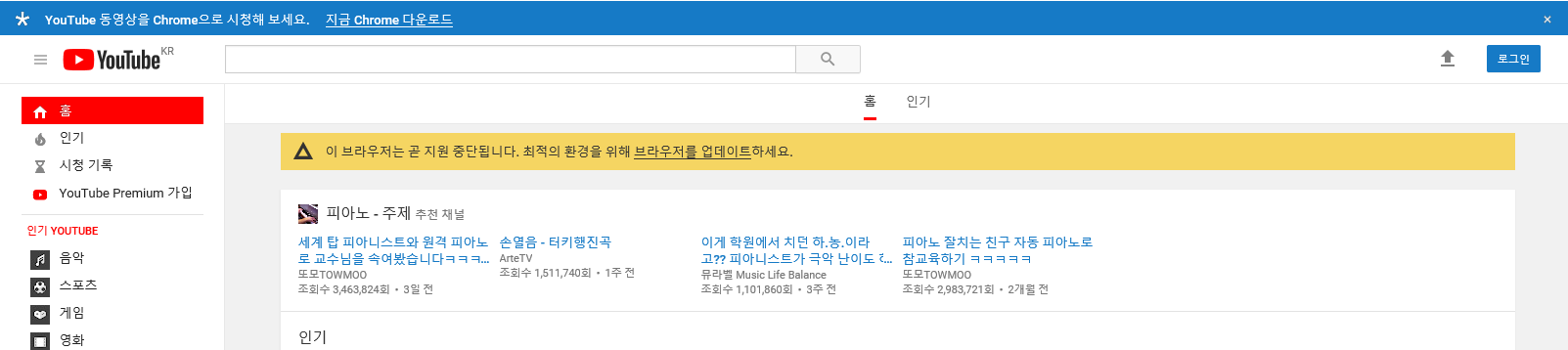 최신 UI에 호환되지 않는 익스플로러에서 유튜브 지원 중단
