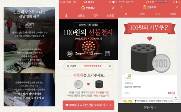 카카오톡 어플 서비스 중 하나인 '카카오톡 선물하기'에서 100원 기부 쿠폰을 구매하면, 카카오가 500원을 더해 건당 총 600원(연탄 한 장 가격)을 어려운 이웃들에게 난방비와 연탄 등으로 전달하는 매칭그랜트 방식의 캠페인입니다. 카카오톡 선물하기 이용자들이 쉽고 부담 없이 기부에 참여할 수 있도록 기획한 결과 약 4,600만 원이 모여 총 133 가정에 따뜻함을 전달했다고 해요.