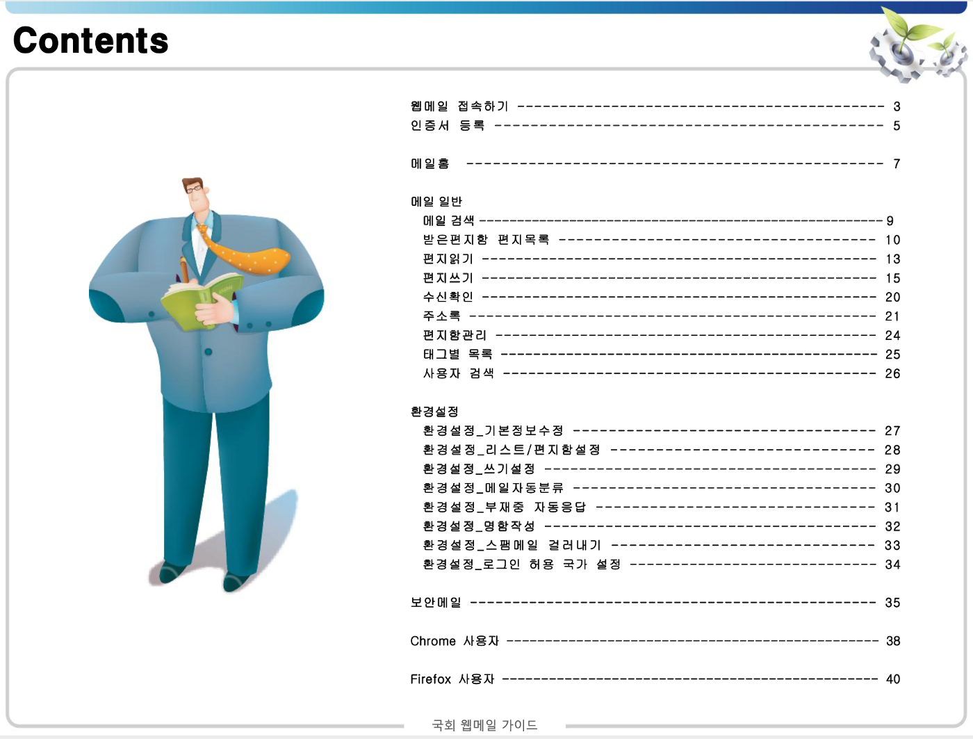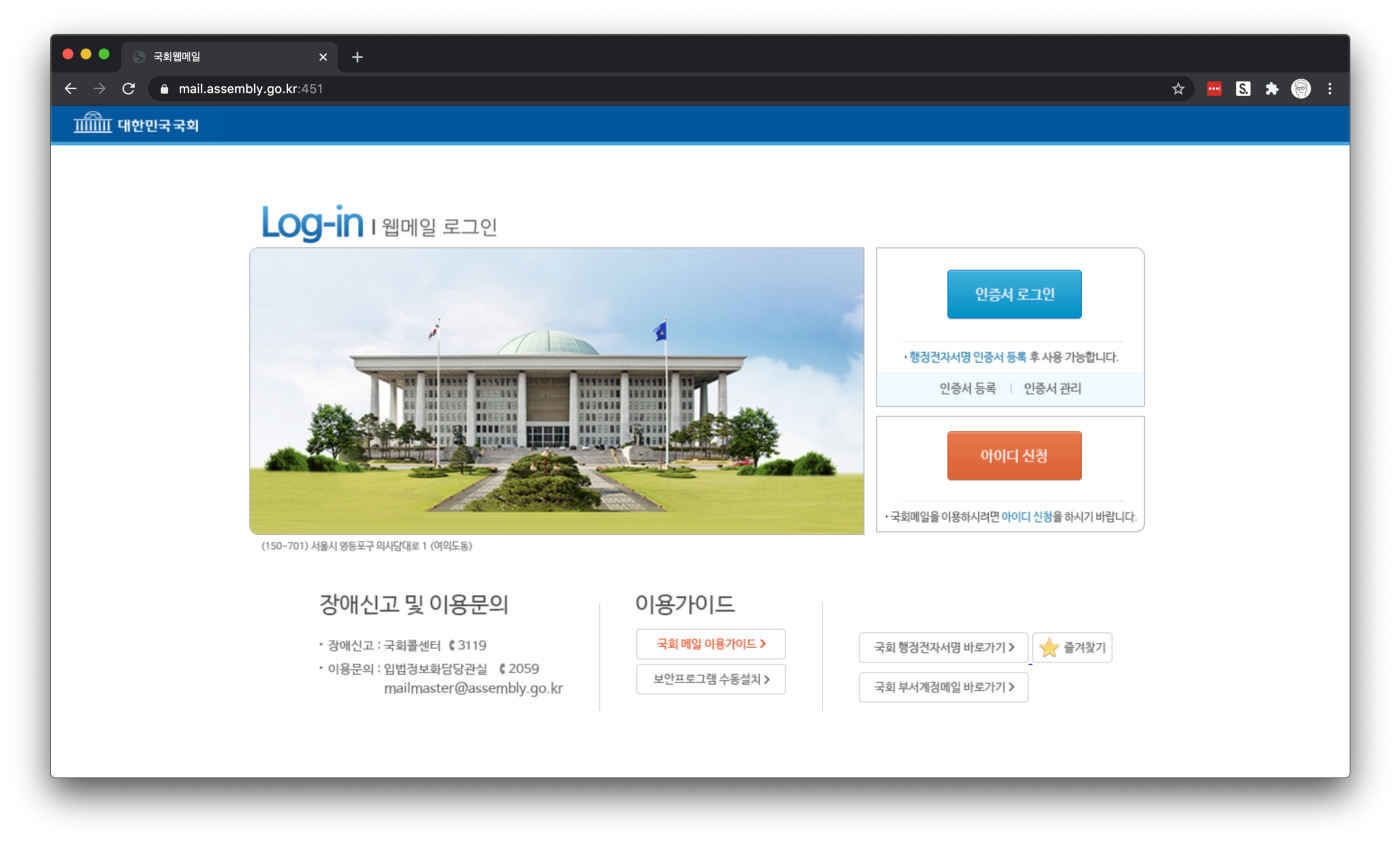 국회 웹메일에 접속해 봤습니다. 국회 외부에서도 보안 프로그램을 설치하고 '행정전자서명 인증서'만 등록하면 접근하는 데 문제가 없습니다. '국회 웹메일 가이드'라는 문서를 읽어보니 '로그인 허용 국가'를 별도로 설정할 수 있는 것으로 봐서 국외 출장 중에도 사용할 수 있습니다. 크롬 브라우저, 파이어폭스 브라우저에서의 사용법도 안내하고 있습니다.