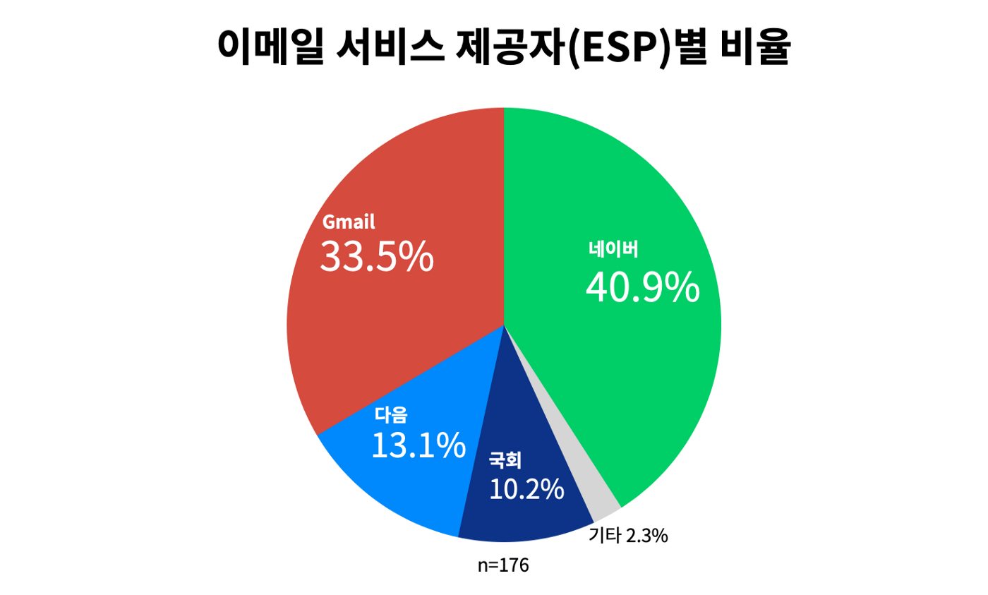 이메일 주소가 기입된 176명 중 국회에서 제공하는 이메일 계정(id@assembly.go.kr, id@na.go.kr)을 사용하는 의원은 18명 뿐으로, 10.2% 수준입니다. 즉 나머지 158명은 사적인 이메일 주소를 공적인 의정활동에 사용하고 있습니다.