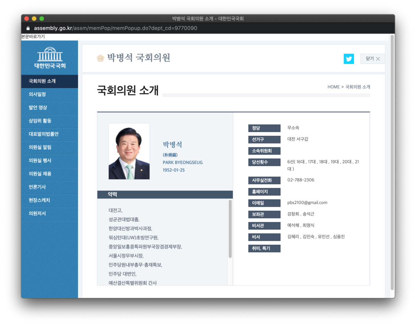 그래서 국회의원현황 페이지에 가서 몇몇 의원들의 이메일 주소를 찾아봤는데 놀라움을 금할 수 없었습니다. 그래서 국회의원 300명 모두의 이메일 주소를 확인하고 그것을 분석한 결과를 공개합니다. (공공데이터포털에 국회의원 정보 API가 있으나, 최종 수정일이 2020년 2월 24일이고 이메일 주소는 기입되어 있지 않습니다. 그래서 2020년 6월 28일 기준 국회 홈페이지 '국회의원현황'에 기입된 데이터를 전부 수집해서 분석했습니다.)