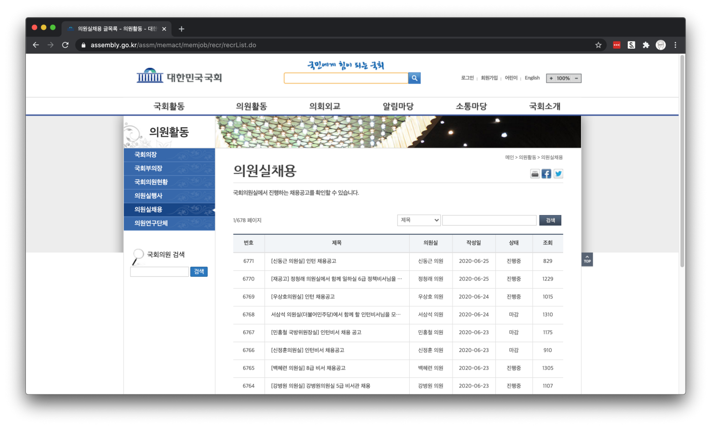 그래서 국회의원현황 페이지에 가서 몇몇 의원들의 이메일 주소를 찾아봤는데 놀라움을 금할 수 없었습니다. 그래서 국회의원 300명 모두의 이메일 주소를 확인하고 그것을 분석한 결과를 공개합니다. (공공데이터포털에 국회의원 정보 API가 있으나, 최종 수정일이 2020년 2월 24일이고 이메일 주소는 기입되어 있지 않습니다. 그래서 2020년 6월 28일 기준 국회 홈페이지 '국회의원현황'에 기입된 데이터를 전부 수집해서 분석했습니다.)