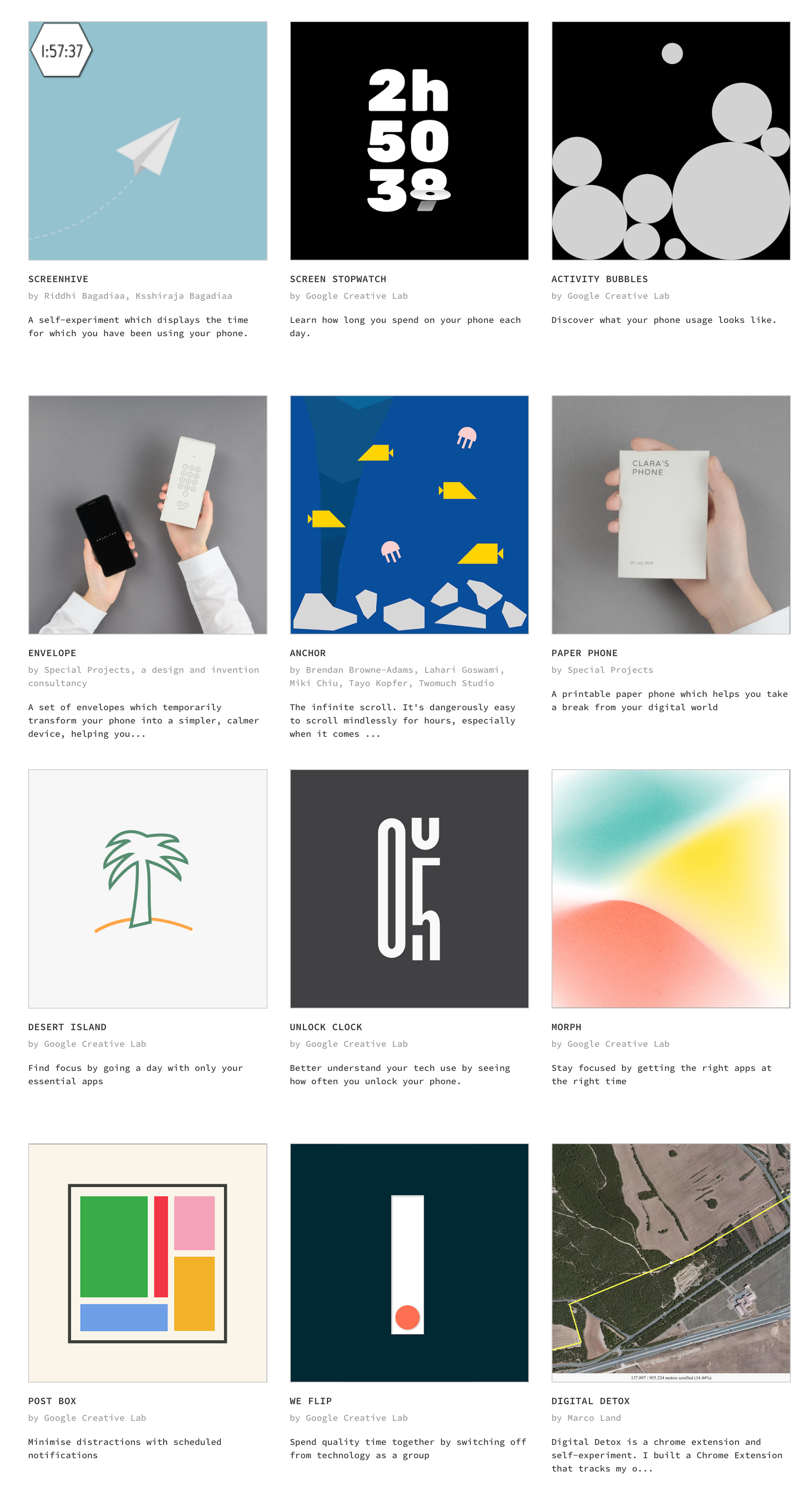 구글크리에이티브랩은 2019년부터 2020년까지 '디지털 웰빙 실험'을 통해 디지털 웰빙 앱 11개를 내놓았어요. 안드로이드 폰에서만 사용할 수 있지만 모두 오픈소스로 개발됐고요. 가이드와 팁을 공개해두었어요. 크게 집중력을 높여주는 앱, 사용 시간을 줄여주는 앱이 있습니다. 딱 잘라 나눌 수는 없지만 대략 나눠서 소개해볼게요.