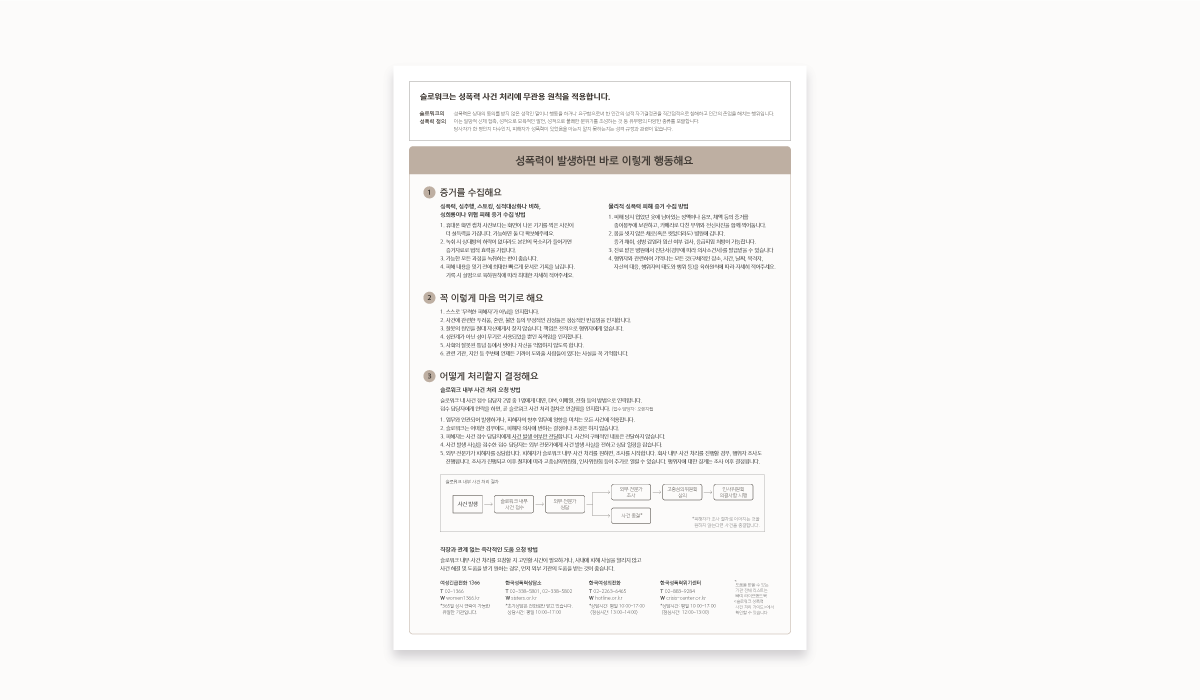 무관용 원칙의 적용을 가장 첫머리에, 피해자가 '이것이 성폭력인가'에 대한 혼란을 줄일 수 있도록 성폭력의 정의를 그다음에, 발생 시 바로 해야 할 행동을 순서대로 이어서 정리했습니다. 보통 이런 가이드를 만들 때 슬로워크의 키 컬러인 오렌지색을 주로 활용하는데요. 발랄하고 경쾌한 느낌이 있어 성폭력 사건에는 어울리지 않아 보였어요. 그래서 마음을 차분하게 가라앉히는 데 도움을 줄 수 있도록 보조 컬러인 슬로워크 웜그레이 색상 팔레트를 적용해 따뜻한 느낌이 들게 작업했습니다.