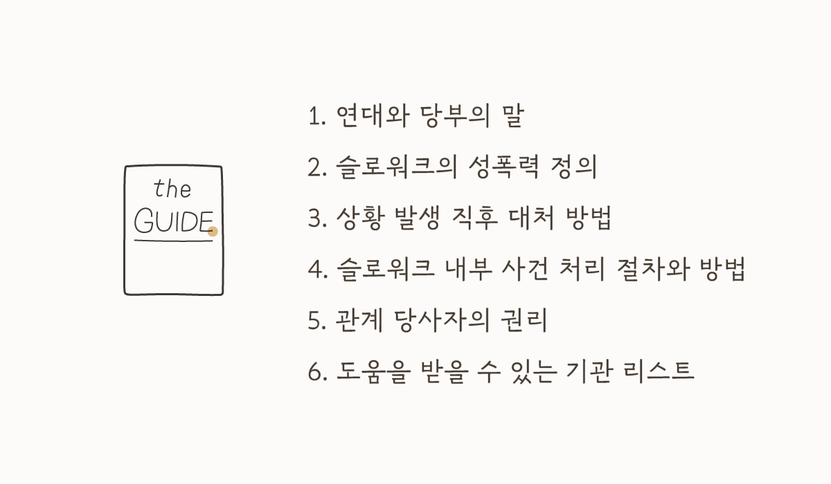 이 가이드에서 우리는 슬로워크는 성폭력을 어떻게 정의하는지, 상황이 발생했을 때 당사자와 주변인은 어떻게 대처해야 하는지, 도움을 받을 수 있는 절차는 어떤 경우가 있는지 상세하게 기술했어요. 사건이 발생하면 즉각적으로 대처해야 하고, 그보다는 상황 자체가 발생하지 않기 위해 구성원 모두가 반드시 유념해야 하는 내용을 담았어요. 기획과 작성, 편집에 당시 여성자유보장위원회 Pitch(이하 Pitch) 위원 오수희, 쏠(김한솔), HQ(사업운영본부)의 누들(성노들), 펭도(조성도)의 많은 수고와 노력이 담겼습니다.