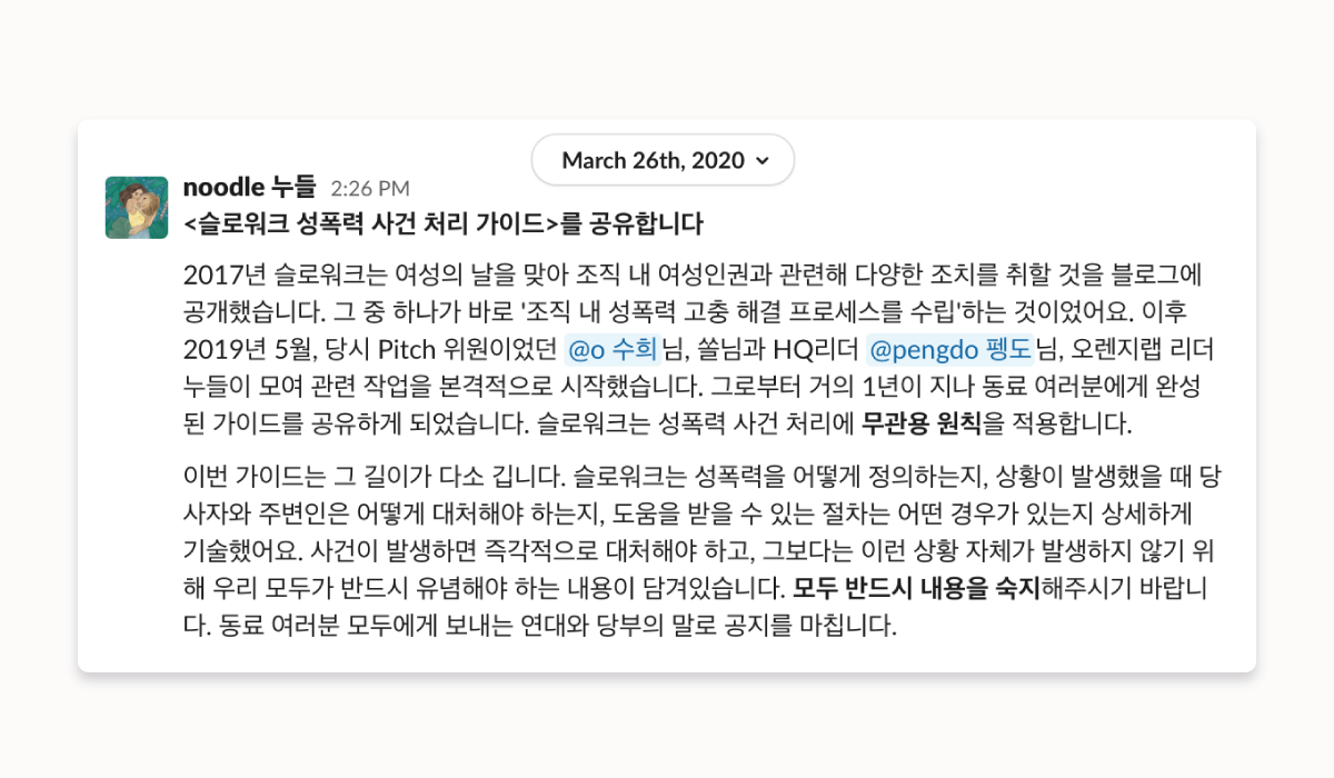 그렇게 완성된 가이드는 오수희와 누들이 2차에 걸쳐 최종 윤문을 보고, 본격적인 제작 1년 만에 사내 전체공지를 할 수 있었습니다. 7번의 공식적인 회의와 오며 가며 나누던 셀 수 없는 대화와 논의의 결실이었습니다. 작업에 참여한 모두가 기획자, 디자이너, 라이터 등의 본업이 있었기 때문에 예상보다 긴 시간이 걸렸지만, 이 작업을 결국 완료해냈다는 데 가장 큰 뿌듯함을 느꼈습니다. 그리고 무엇보다 회사가 모든 구성원을 향해 성폭력에 "관용은 없다"는 무관용 원칙을 천명한 것, 그리고 피해자의 보호와 일상의 회복을 위해서만 전념할 것을 공식 문서로 만들어 배포했다는 것이 여성 구성원으로서 큰 힘이 되었어요.