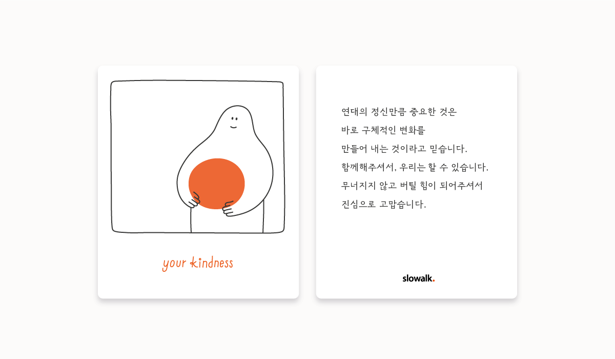 여러분도 잘 아시다시피, 슬로워크는 "창의적이고 영감을 주는 솔루션을 통해 조직과 사회의 변화에 기여하고, 이러한 변화를 지향하는 사람들의 네트워크를 확대하는 것"이라는 미션을 갖고 함께 움직이는 가치 중심의 조직입니다. 우리가 추구하는 가치와 해내야 하는 일은 결코 쉽지 않지만, 그렇다고 마냥 어렵기만 한 일도 아닙니다. 좋은 동료, 좋은 이해관계자와 함께한다면 어렵지만 할만하기도 한 것이죠. 우리는 그것을 경험으로 이미 알고 있습니다.
