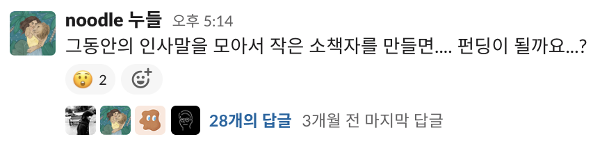 한 달 정도의 기획, 샘플 제작 기간을 두고 펀딩 페이지 오픈 일정을 정하고 후원 선물 구성은 같은 팀 디자이너 길우가 고민하기로 했어요(후원 선물 이야기는 다른 콘텐츠에서 곧 공개할게요). 메인 굿즈인 책을 기획하는 것이 우선이었습니다.