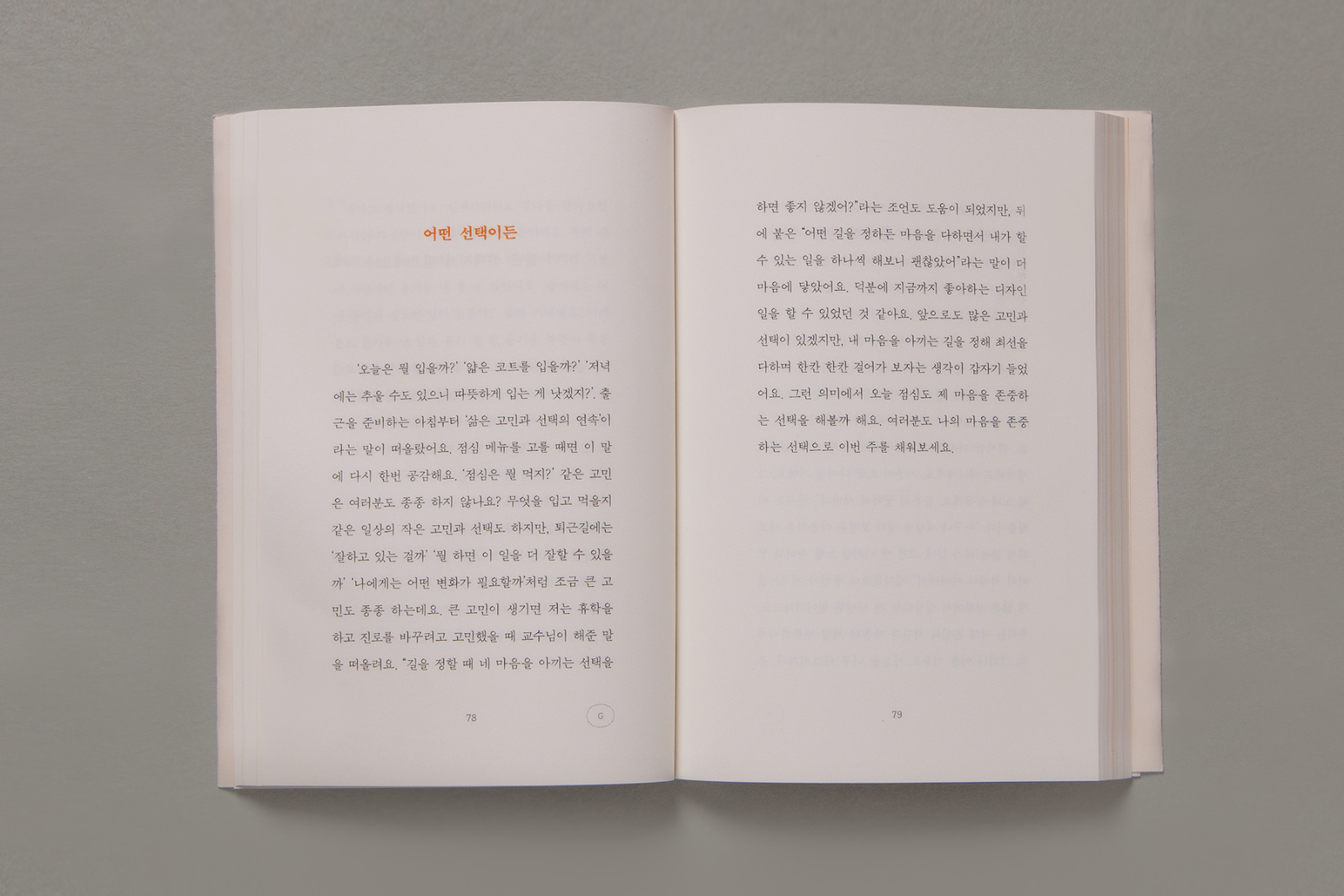 구독자와의 거리를 좁히는 방법으로 글을 다루는 사람이 낼 수 있는 아이디어는 '책'이었고, 바로 함께 인사말을 쓰던 팀 동료들에게 공유했어요. 자신 없이 제안했는데 다들 ‘도전해보자'는 긍정적인 반응이어서 힘을 얻었습니다. 그동안 오렌지레터 굿즈 출시를 기다려주셨던 몇몇 구독자분들에게도 좋은 소식이 되겠다고 생각했어요.