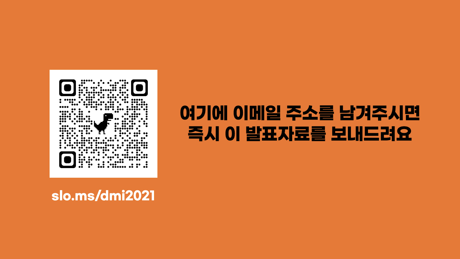 어떻게 활용하면 되는지 제가 알려드릴게요. 위 QR코드를 스캔하거나, slo.ms/dmi2021으로 들어와서 이메일 주소를 남겨주시면 즉시 제가 컨퍼런스에서 발표한 자료(PDF)를 메일로 보내드려요(풍부한 실제 사례 등, 이 글에 소개되지 않은 비밀 슬라이드까지 확인할 수 있어요).