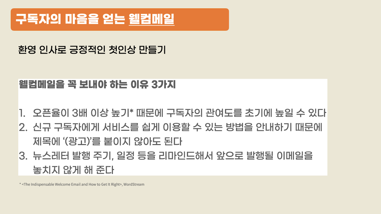인사 잘하는 사람 다들 좋아하시죠? 뉴스레터도 인사성이 밝으면 구독자들이 좋아합니다. 구독 즉시 보내는 웰컴메일로 환영 인사를 해보세요. 웰컴메일은 구독자가 한 행동(구독신청)의 결과이기 때문에 오픈율이 다른 메일에 비해 3배 이상 높아요. 덕분에 구독자의 관여도를 초기에 높일 수 있습니다. 그리고 신규 구독자에게 서비스를 쉽게 이용할 수 있는 방법을 안내하기 때문에 제목에 ‘(광고)’를 붙이지 않아도 돼요. 웰컴메일에서 뉴스레터 발행 주기, 일정 등을 리마인드하면 앞으로 발행될 메일을 놓치지 않는 데 도움이 됩니다.