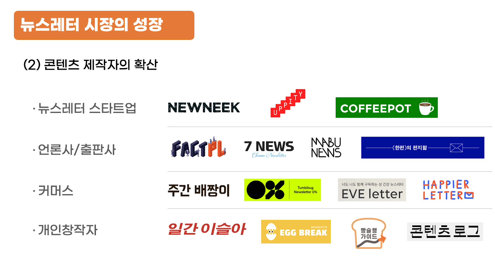 여러분이 잘 아는 뉴스레터를 기반으로 시작한 스타트업들도 잘 나가가고요, 콘텐츠에 강점을 가진 언론사와 출판사들도 뉴스레터를 많이 발행하고 있습니다. 커머스들도 뉴스레터로 고객과 긴밀하게 소통합니다. 개인 창작자들도 뉴스레터에 진심인 분들이 많습니다.