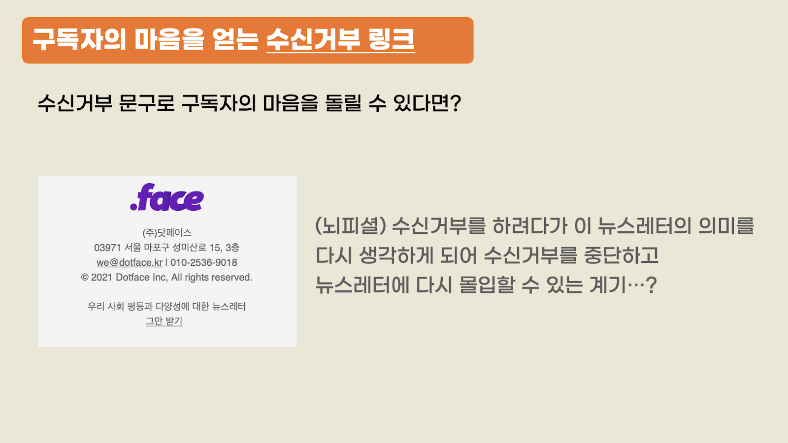 이 뉴스레터에 대한 마음이 떠나서 수신거부를 하려던 구독자의 마음을 돌릴 수도 있을까요? 닷페이스는 수신거부 링크 바로 위에 "우리 사회 평등과 다양성에 대한 뉴스레터"라는 문구를 넣었어요. 수신거부를 하려던 구독자가 이 뉴스레터의 의미를 다시 생각하게 되어 수신거부를 중단하고 뉴스레터에 다시 몰입할 수 있는 계기가 될 수 있지 않을까요? (뇌피셜입니다)