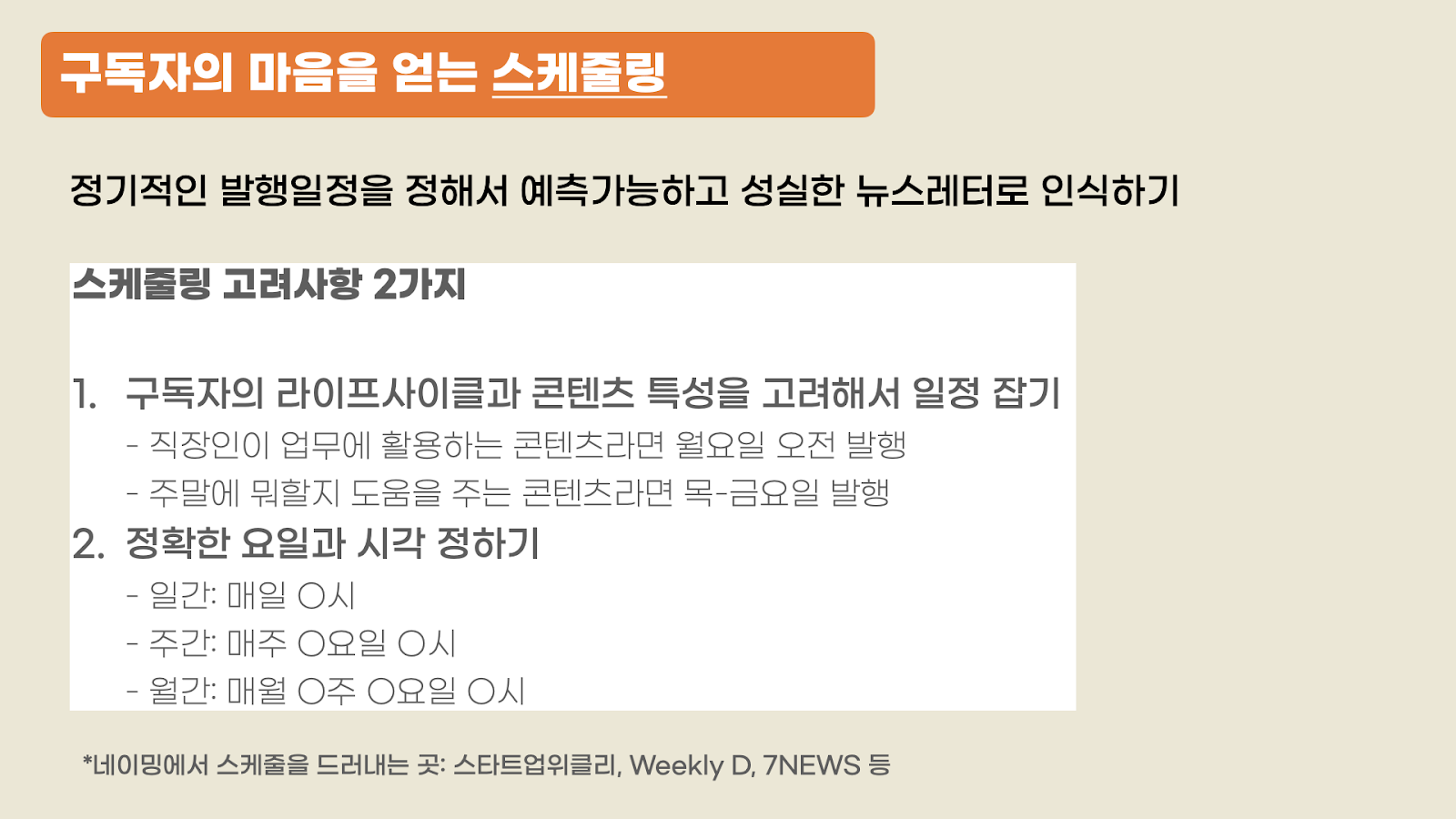 스타트업 위클리, Weekly D, 7NEWS 등 네이밍에서 스케줄을 드러내는 곳도 있습니다.