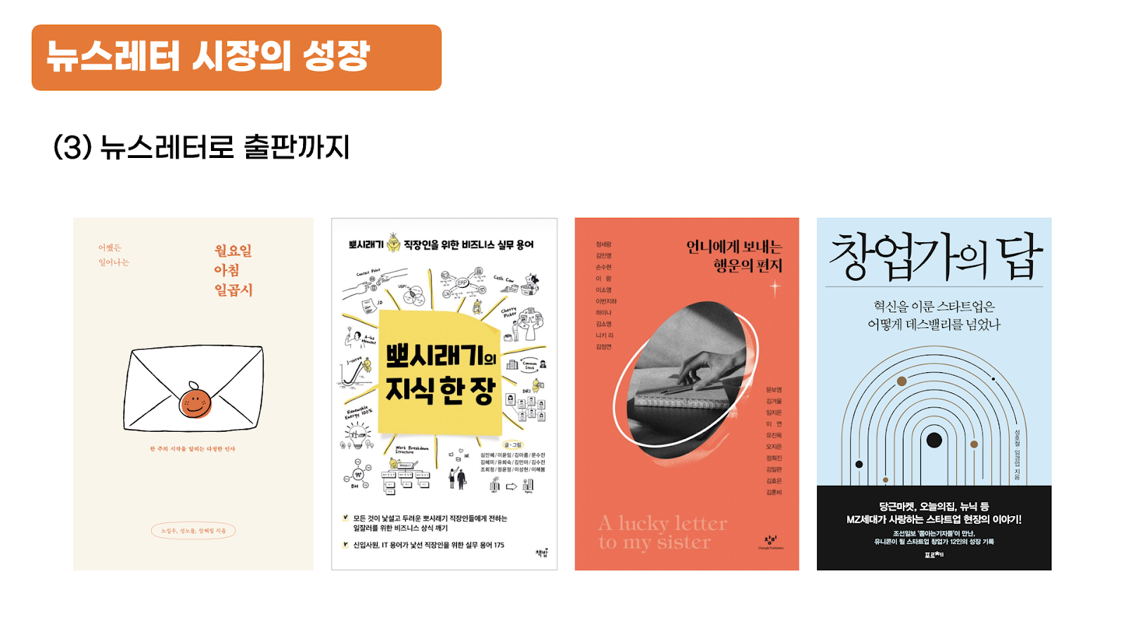 심지어 뉴스레터가 출판으로 이어지는 사례도 있어요. <오렌지레터> 인트로를 모아 만든 <월요일 아침 일곱시>를 비롯해 이런 사례들이 점점 늘어나고 있습니다. 뉴스레터가 가진 콘텐츠의 장점을 잘 살리는 거죠.