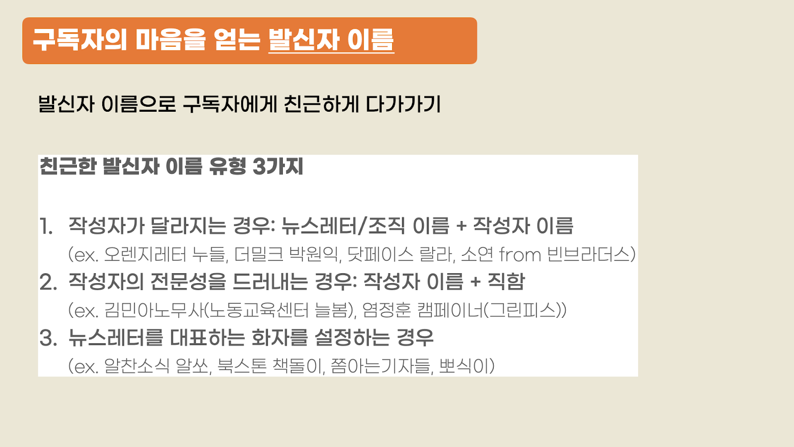 뉴스레터 작성자가 매번 달라지는 경우에는 '오렌지레터 누들', '더밀크 박원익', '닷페이스 랄라', '소연 from 빈브라더스'처럼 뉴스레터 이름이나 조직 이름 뒤에 작성자 이름을 덧붙이기도 해요. 노동교육센터 늘봄의 '김민아 노무사', 그린피스의 '염정훈 캠페이너'처럼 작성자의 전문성을 드러내는 경우도 있어요. '알찬소식 알쏘', '북스톤 책돌이', '쫌아는기자들', '뽀식이'처럼 뉴스레터를 대표하는 화자를 설정하는 경우도 있습니다.