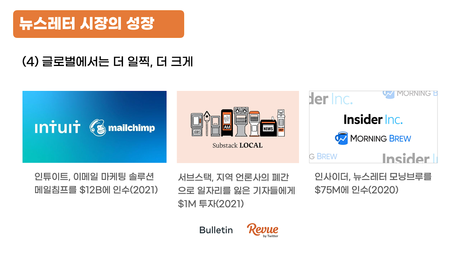 그런데 뉴스레터 시장의 성장이 글로벌 관점에서 보면 새로운 것은 아니에요. 미국의 스티비와 같은 메일침프란 회사는 설립된 지 20년쯤 됐는데, 얼마 전에 인튜이트에 120억 달러, 약 14조 원에 인수됐습니다. 개인 창작자들이 많이 사용하는 서브스택이라는 플랫폼에서는 지역 언론사의 폐간으로 일자리를 잃은 기자들에게 100만 달러를 투자하는 '서브스택 로컬'을 발표했고요, 페이스북은 Bulletin을 만들고, 트위터는 Revue를 인수하는 등 서브스택의 경쟁 프로덕트에 투자하고 있습니다. 모닝브루라는 뉴스레터는 2020년에 7,500만 달러에 인수되기도 했습니다.