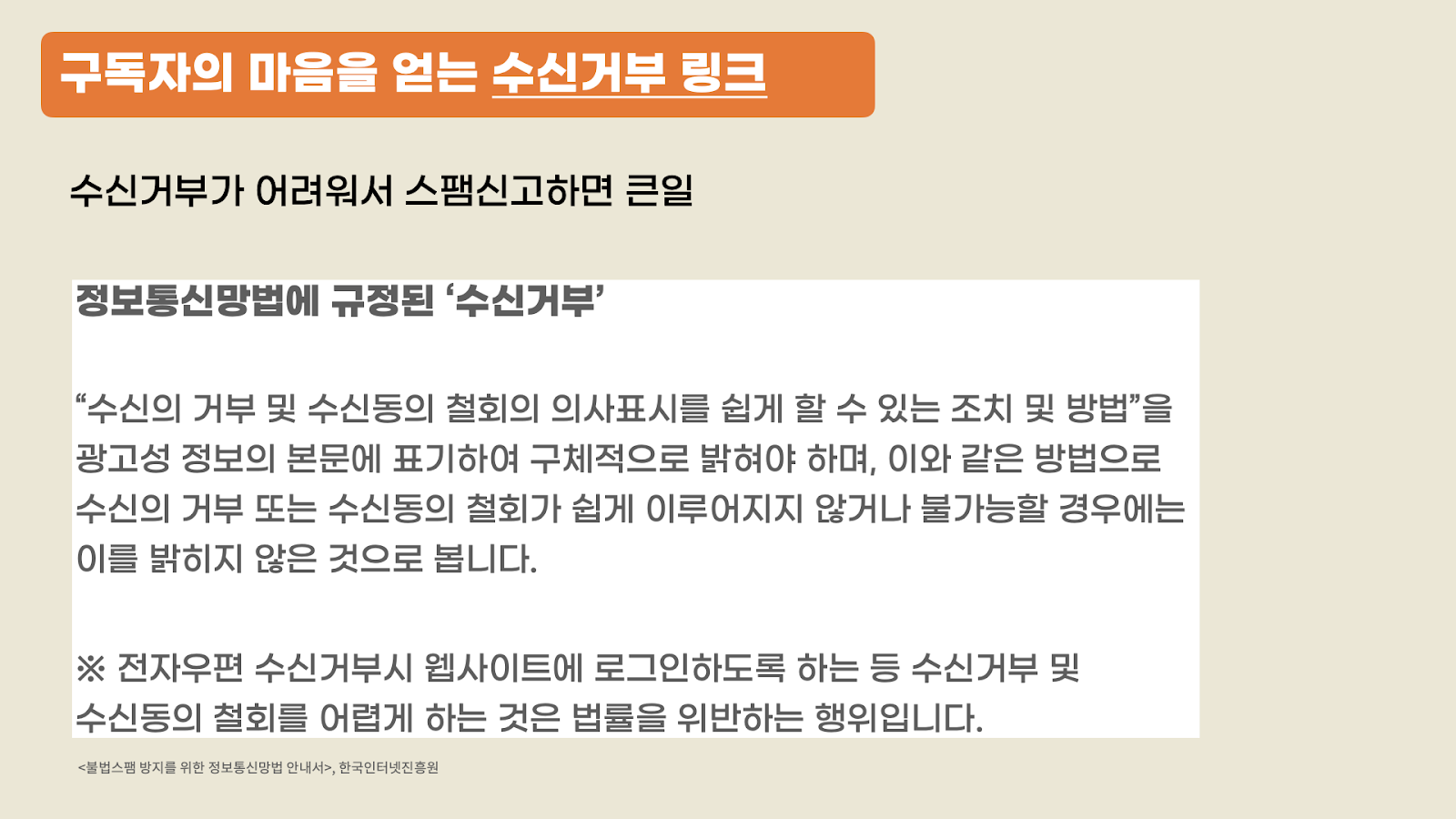 메일 본문 가장 하단에 위치하게 되는 '수신거부' 링크에 대해서도 알아볼게요. 정보통신망법에 수신거부 링크를 반드시 삽입하도록 규정되어 있습니다. 수신거부 링크가 없으면 구독자가 수신거부하고 싶을 때 발신자 차단이나 스팸신고를 하게 되는 불상사가 일어날 수도 있습니다. 스팸신고가 누적되면 발신자 이메일 주소와 도메인네임의 평판이 낮아지고 스팸 필터가 해당 뉴스레터를 학습하게 되어 다른 구독자들의 메일함에서도 스팸처리되는 일이 발생할 수 있습니다.