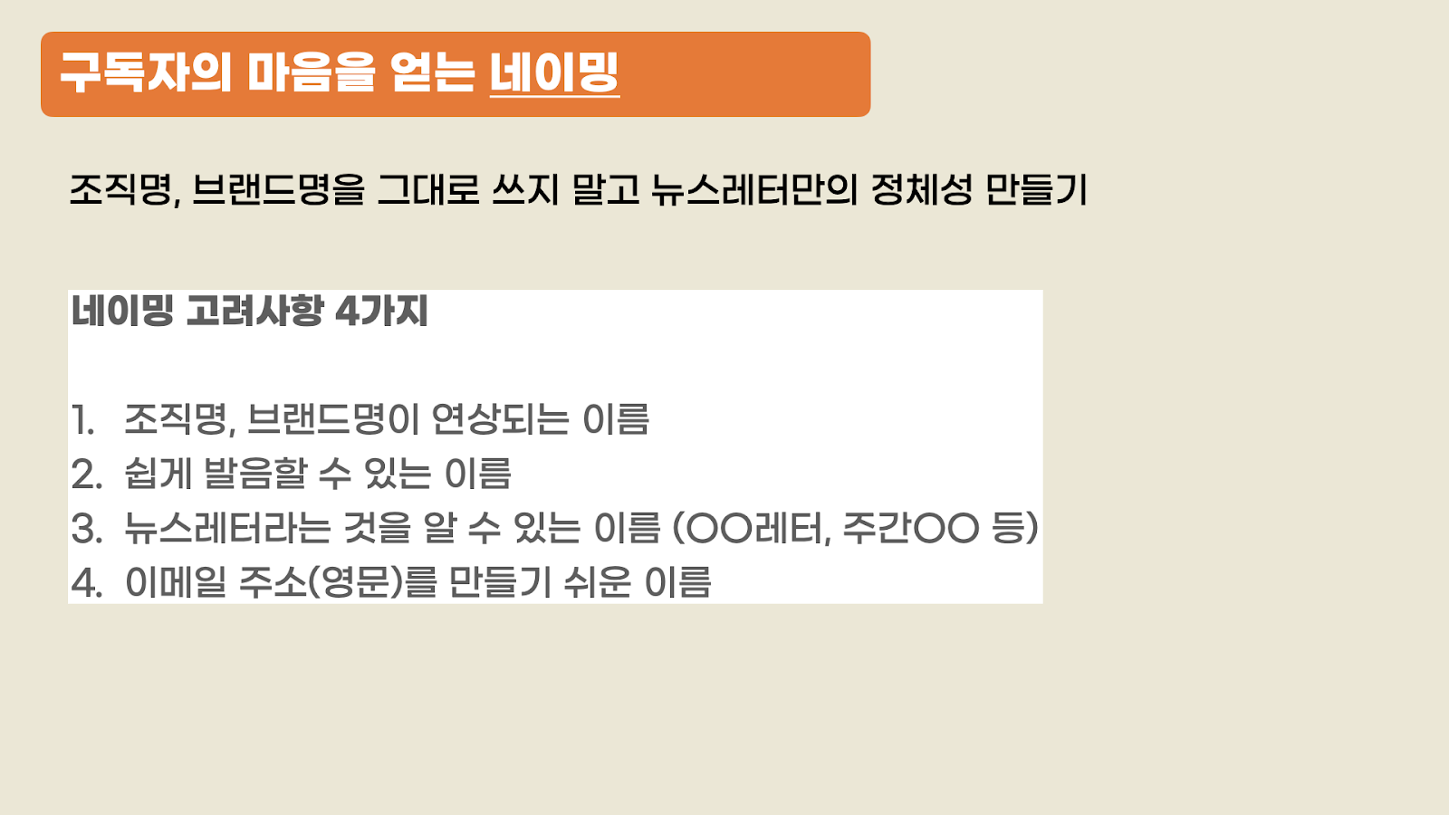 이제부터 구독자의 마음을 얻는 네이밍, 스케줄링, 웰컴메일, 발신자 이름, 제목, 인트로, CTA, 수신거부 링크 전략까지 8가지를 하나하나 알려드릴게요.