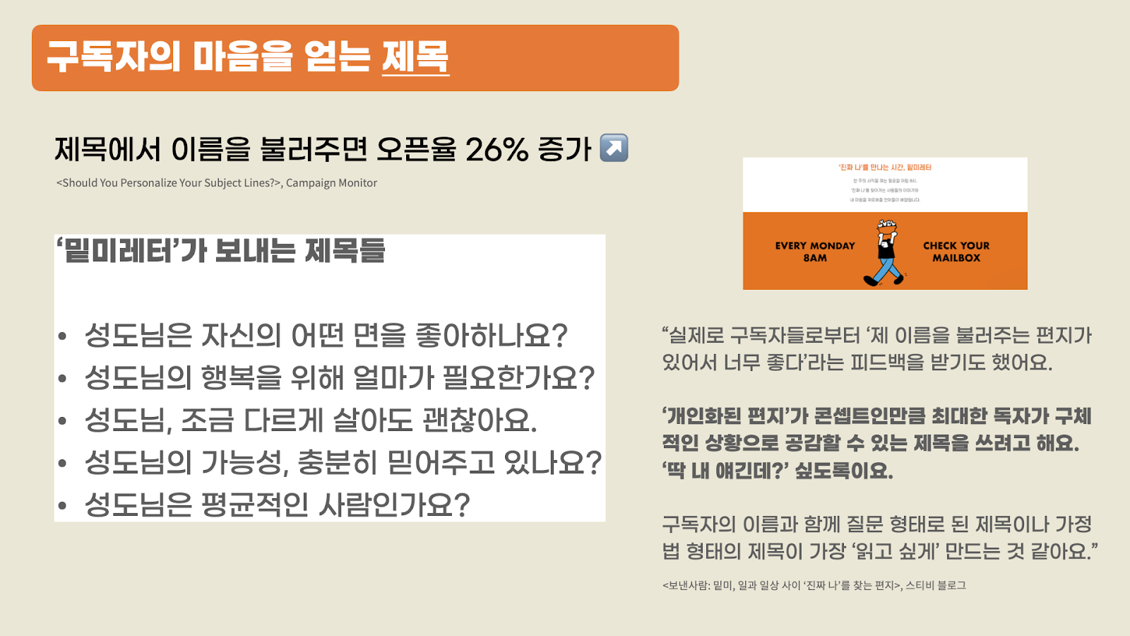 제목은 어떻게 작성하면 좋을까요? 제목에서 이름을 불러주면 그렇지 않은 메일보다 오픈율이 26% 증가한다는 조사 결과가 있습니다. '밑미레터'가 제목에서 매번 이름을 불러주고 있어요. 그렇다고 갑자기 다음 주 메일 제목에 이름을 추가하고, 오픈율이 증가하기를 바라면 곤란해요. 밑미처럼 컨셉을 잡고 꾸준하게 보내야 효과를 볼 수 있습니다.